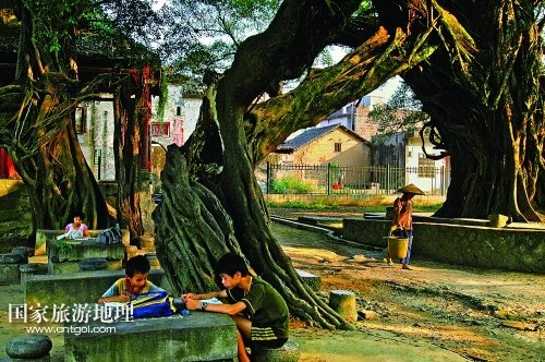 其四,鏡頭也能說(shuō)故事,圖片里面有人文。呂建偉并沒(méi)有把古榕、古建筑當(dāng)作無(wú)生命的標(biāo)本來(lái)拍攝,而是用鏡頭來(lái)記錄那方水土中人們的生存環(huán)境、生活內(nèi)容和精神風(fēng)貌,讓平面的圖片凸顯出豐富的、具有特色的人文元素來(lái)。從圖片的標(biāo)題《冬陽(yáng)遍灑暖人間》、《古榕塘畔好“擺古”》、《憶往昔舊事歷歷味更濃》、《看今朝雛燕展翅欲高飛》中,就能看出作者“以攝影圖片說(shuō)人文”的理念。