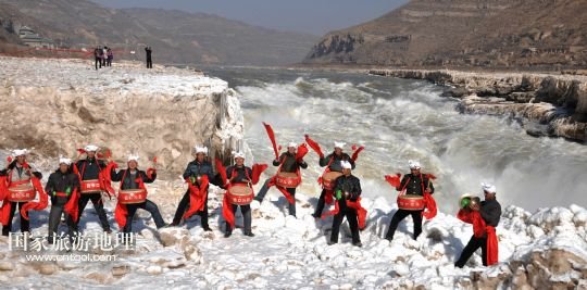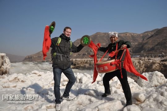 國(guó)家旅游地理 陜西延安1月26日訊 1月25日,一名游客在黃河壺口瀑布景區(qū)與民俗演員合影留念。當(dāng)日,受凌汛影響一度關(guān)閉的黃河壺口瀑布景區(qū)重新開(kāi)放迎賓,游客可近距離欣賞“冰瀑玉壺”的壯麗景觀。 /新華社發(fā)(呂桂明 攝)