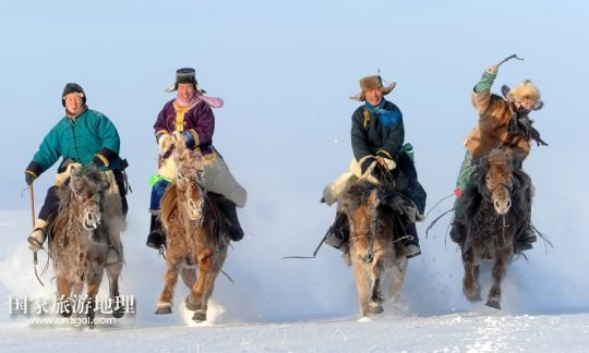 牧民在內(nèi)蒙古呼倫貝爾市新巴爾虎左旗的冬季賽馬會上策馬揚(yáng)鞭(2011年1月1日攝)。
