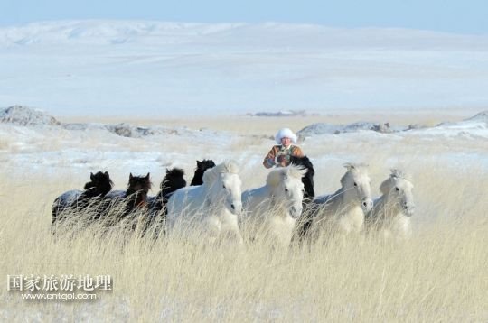 國家旅游地理 1月30日訊 一群蒙古馬在內(nèi)蒙古錫林郭勒盟阿巴嘎旗涉水奔馳(2013年7月20日攝)。風(fēng)從草原吹過,留下多少傳說。在內(nèi)蒙古草原,駿馬與人為伴,縱橫馳騁,一直和諧相處到今天。在漫長的歷史長河中,駿馬陪伴著人們走過了滄桑歲月,留下了許多可歌可泣的動人傳說。