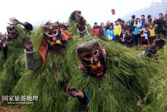 國(guó)家旅游地理 廣西柳州2月20日訊 2月16日,一名苗族青年戴著面具、披著芒草,扮成 “芒哥”跳舞。當(dāng)日是農(nóng)歷正月十七,地處深山的廣西柳州市融水苗族自治縣安陲鄉(xiāng)在江門(mén)苗寨舉行傳統(tǒng)的“芒哥節(jié)”。眾多苗族男性青少年戴著面具、披著芒草、扮成“芒哥”起舞,為人們驅(qū)邪避禍,送去新春的祝福。據(jù)介紹,演“芒哥”是當(dāng)?shù)孛缂胰霜?dú)具特色的新春傳統(tǒng)活動(dòng)之一。 /新華社發(fā)(龍濤 攝)