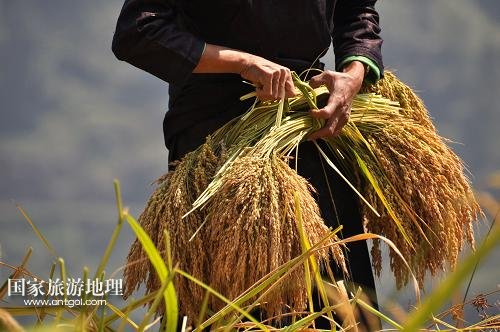 國(guó)家旅游地理 貴州黔東南10月11日訊 10月10日,在貴州省黎平縣順化瑤族鄉(xiāng)高孖村,瑤族群眾在收獲香禾糯。2013年以來(lái),貴州省黔東南苗族侗族自治州黎平縣充分利用當(dāng)?shù)氐锰飒?dú)厚的生態(tài)環(huán)境,采用傳統(tǒng)選育技術(shù),大量種植香禾糯。日前,當(dāng)?shù)剞r(nóng)戶(hù)今年種植的5萬(wàn)畝香禾糯喜獲豐收。香禾糯是貴州省黎平縣國(guó)家地理標(biāo)志保護(hù)產(chǎn)品,是當(dāng)?shù)馗髯迦嗣裨陂L(zhǎng)期的生產(chǎn)生活中選育栽培出來(lái)的優(yōu)良糯稻品種。新華社發(fā)(楊代富 攝)